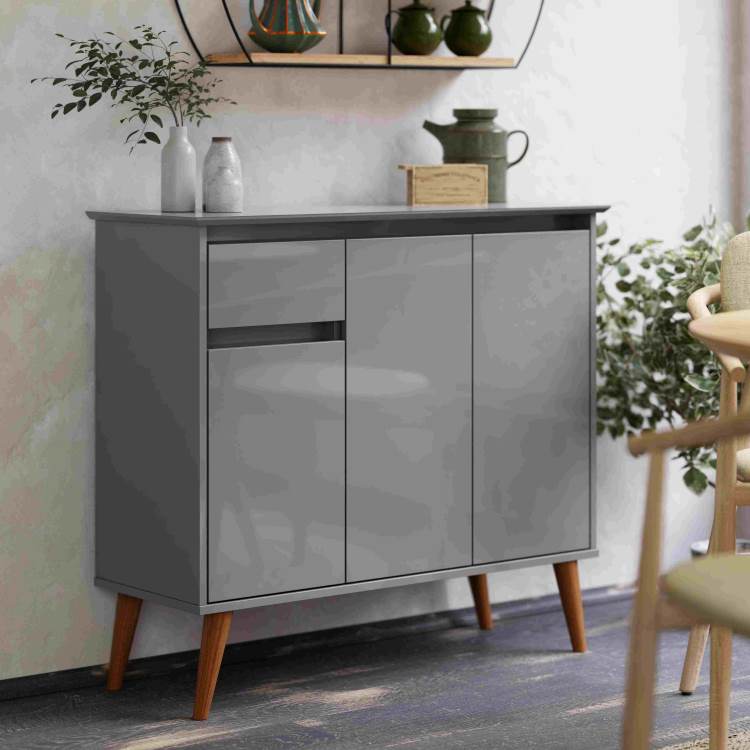 3 Portas de Bater com Dobradiças Metálicas, 1 Gaveta com Corrediça Metálica, 1 Prateleira Interna e Pés Palito de Madeira Maciça.