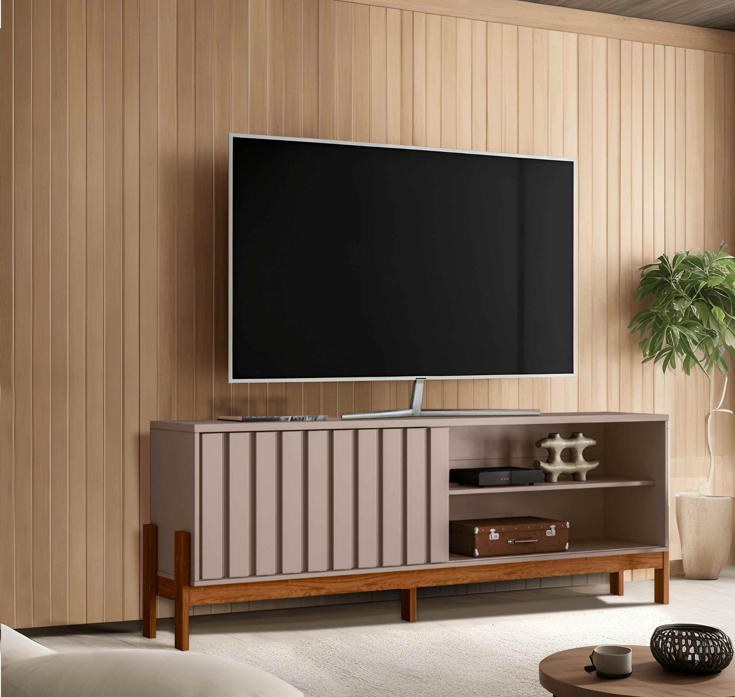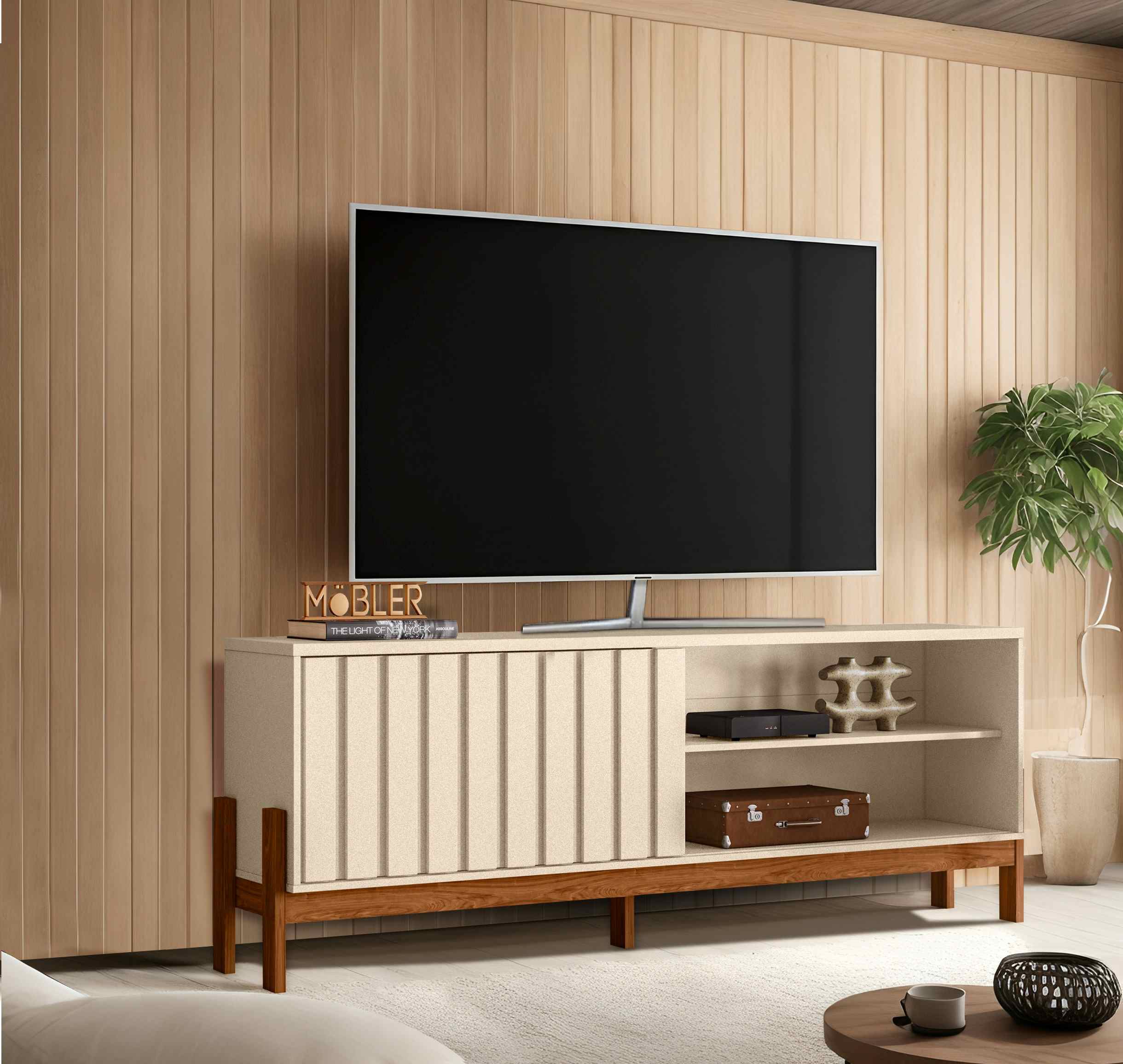 Tampo de 25mm, 1 Porta Ripada Deslizante com Roldanas Metálicas, 2 Nichos Externos Divididos por Prateleira de MDP 15mm, Pés de MDP 25mm, Acabamento em Pintura UV Fosco e Semi-Brilho.