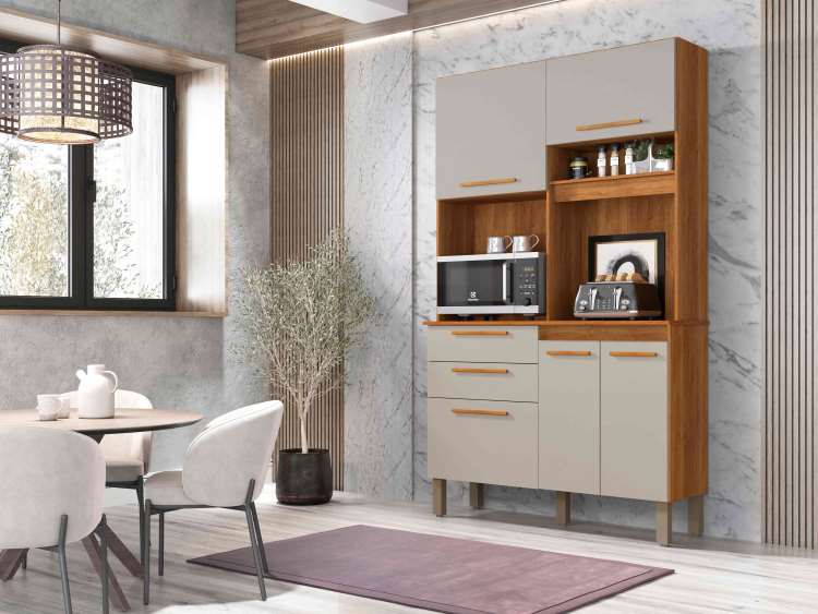 Estrutura 100% MDP Chapas de 12 e 15mm, 5 Portas de Bater com Dobradiças Metálicas, 2 Gavetas com Corrediças Telescópicas, 3 Nichos Externos para Fornos, Portes, Objetos e Utensilios Domésticos, 1 Prateleira Interna, Puxadores de MDP e Pés Plásicos Reguláveis.